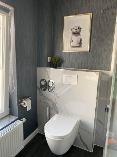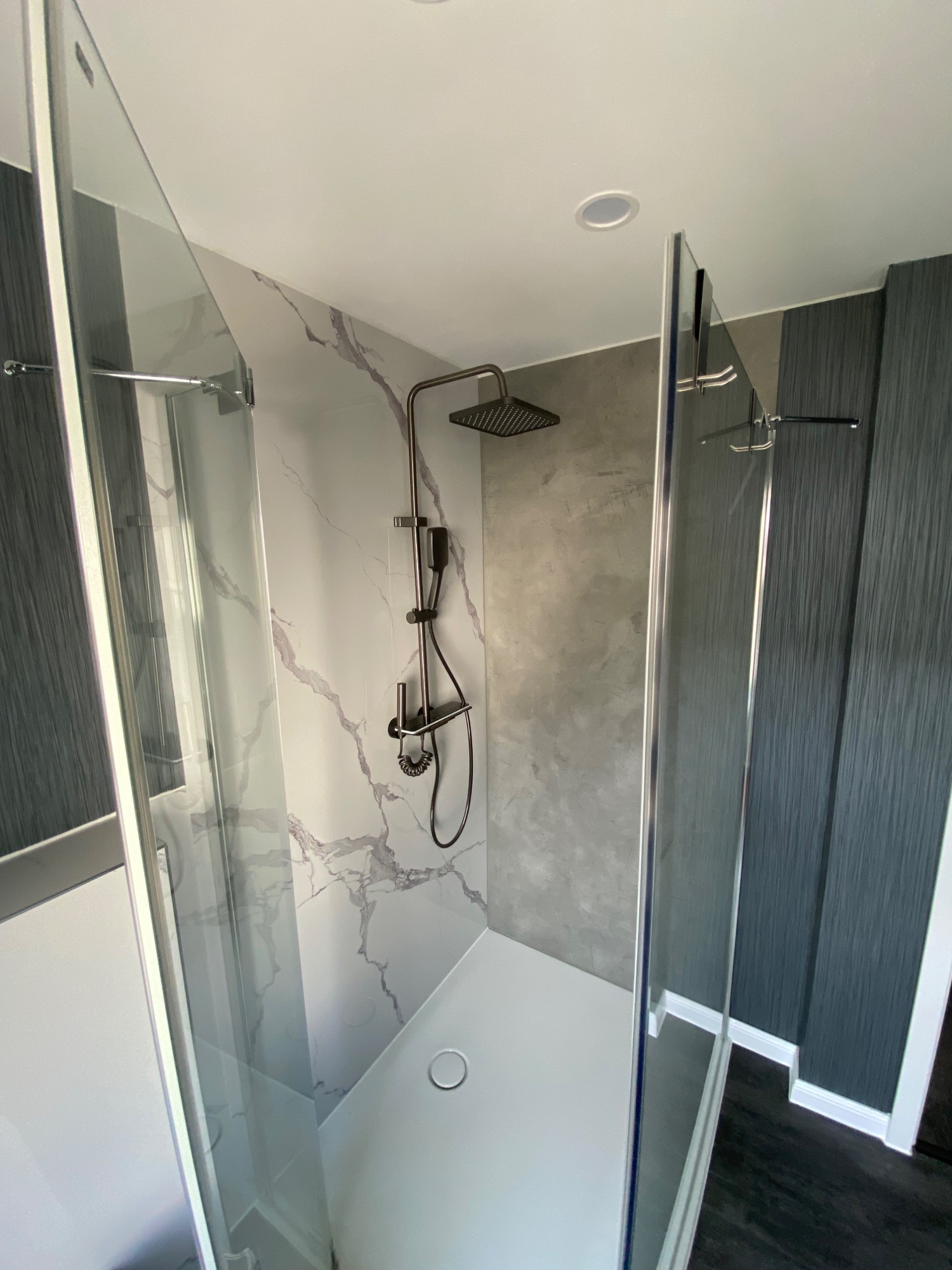 Modernes Badezimmer mit Spiegel, ebenerdige Dusche und Föhn