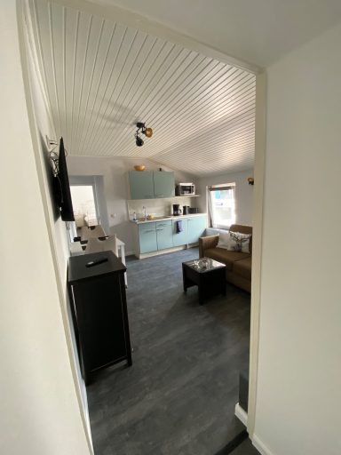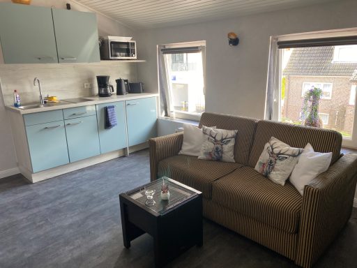 Voll ausgestattete Küchenzeile mit mit 2 Kochfeldern, Mikrowelle, Kaffeemaschine, Toaster und Wasserkocher