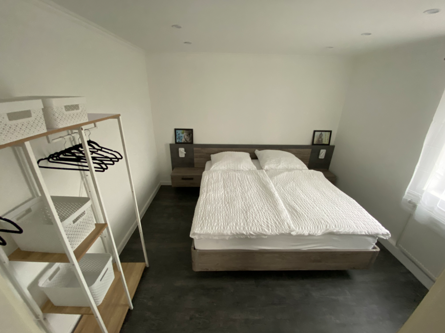 Schlafzimmer mit gemütlichem Doppelbett (180 × 200 cm) und offenem Kleiderschrank